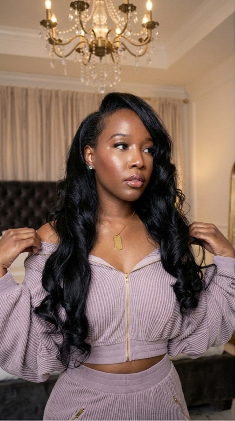• The Bottoms: High-waisted, wide-leg trousers with a matching ribbed texture and gold zipper pocket detailing